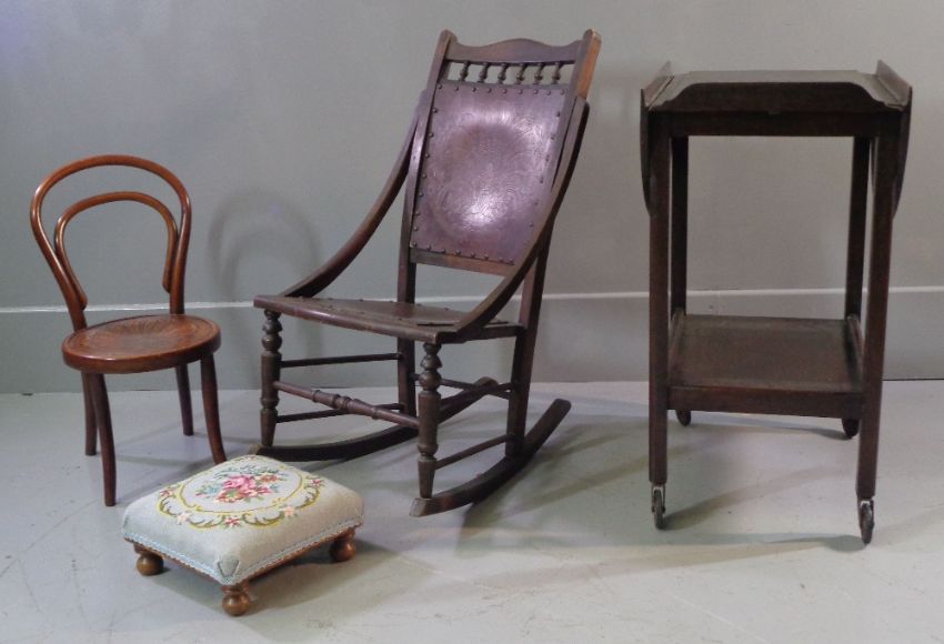 FURNITURE ASSORTMENT to include child's bentwood chair, polished drop side tea trolley, tapestry topped footstool and a rustic rocking chair