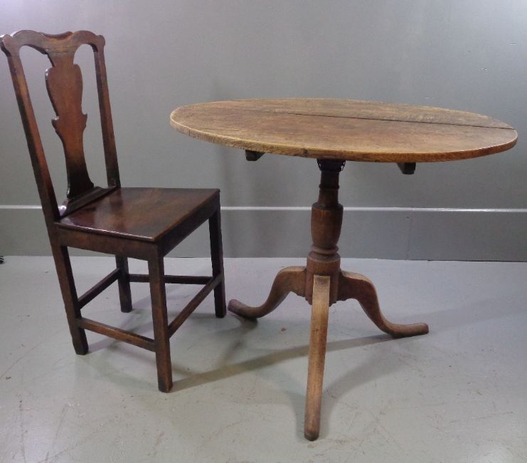 PERIOD OAK CIRCULAR TILT TOP TABLE on tripod supports, 87cms diameter and a splatback farmhouse chair