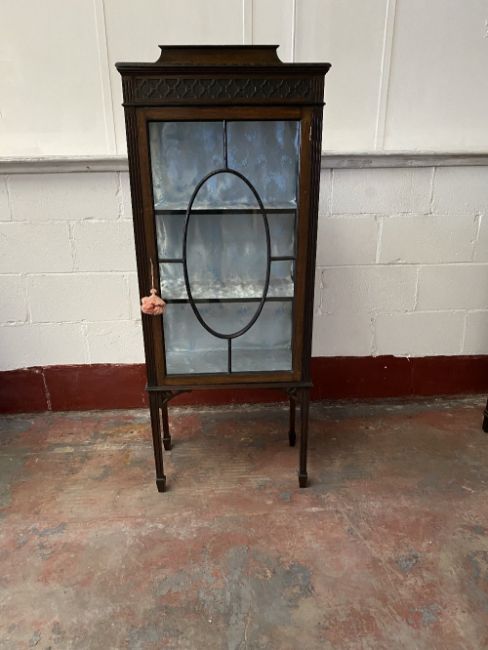 EDWARDIAN CHINA CABINET with single glazed door on spade feet and with railback, 152cms H, 60cms W, 31cms D