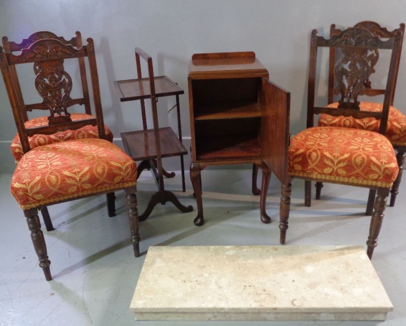 ANTIQUE FURNITURE ASSORTMENT - set of four Edwardian drawing room chairs, walnut effect night stand, mahogany plate stand and a marble hearth