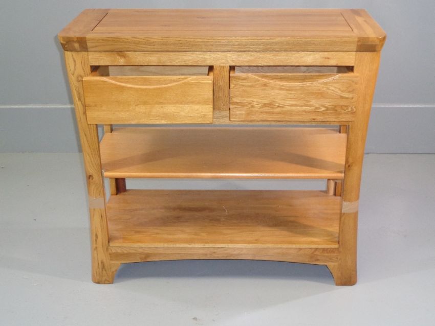 MODERN CONSOLE/HALL TABLE - light oak with two drawers and lower shelf, 79cms H, 85cms W, 35cms D