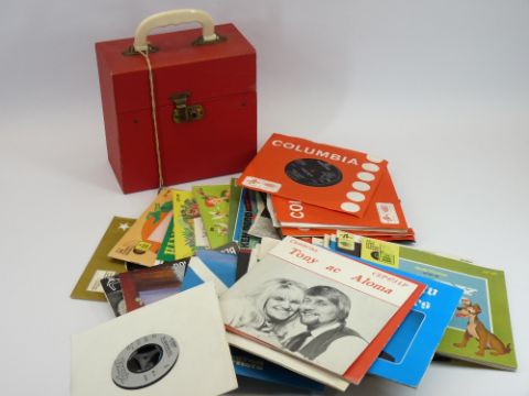 VINTAGE MAHOGANY SWING DRESSING TABLE MIRROR, stylish battery operated mantel clock and two small, framed oils on canvas, 17 x 11.5cms depicting a lady in front of cottages and 17 x 11.5cms figures on a bridge and a mixed collectables group - to include children's and other 45rpm records, boxed set of carpet bowls, Japanese lacquer work box and other items of interest