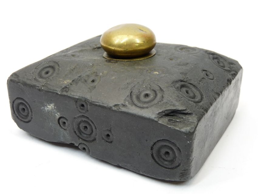 ANTIQUE SLATE DOORSTOP, vintage driving goggles and a pair of oak and chrome twist candlesticks