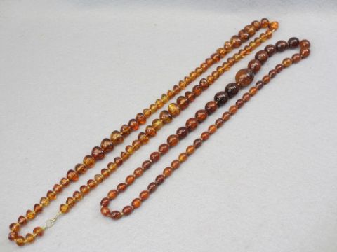 CHERRY, BUTTERSCOTCH, AMBER TYPE BEAD NECKLACES (7) - in a vintage Huntley & Palmer's biscuit tin