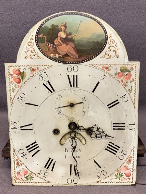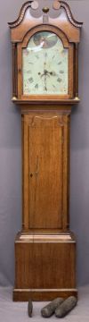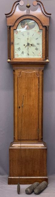 EARLY 19TH CENTURY OAK LONGCASE CLOCK by W Scott, Lauder, arched top painted dial set with Roman numerals and subsidiary seconds dial with date aperture before a twin weight pendulum driven bell strike movement, pendulum and weights included, the single glazed door hood with broken swan neck pediment and brass finial with capped reeded pillars above a long shaped trunk door and stepped base, 207cms overall H, 50cms W