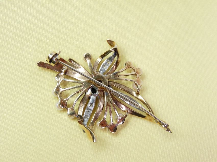 A 9CT GOLD LEAF/FLORAL BROOCH - three central sapphires (or similar) with three diamond encrusted leaves with eleven alternating pearl fronds, 4.7 x 3cms, 7.3ozs gross
