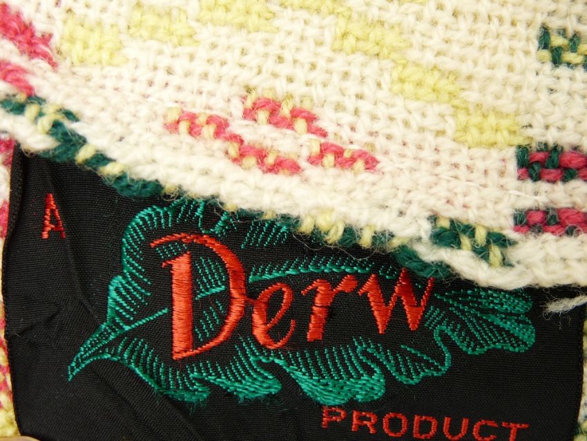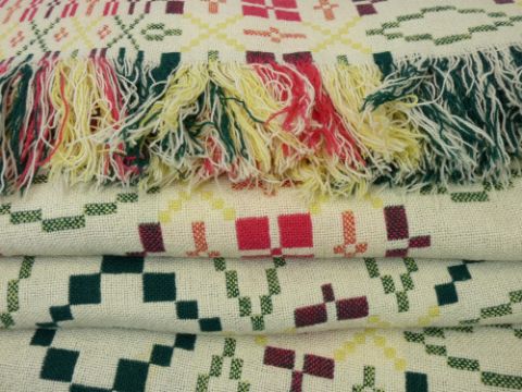 TRADITIONAL WELSH WOOLLEN BLANKET - in colourful yellow, green and red tones, reversible pattern with tasselled ends bearing a 'Derw' product label, 230 x 200cms