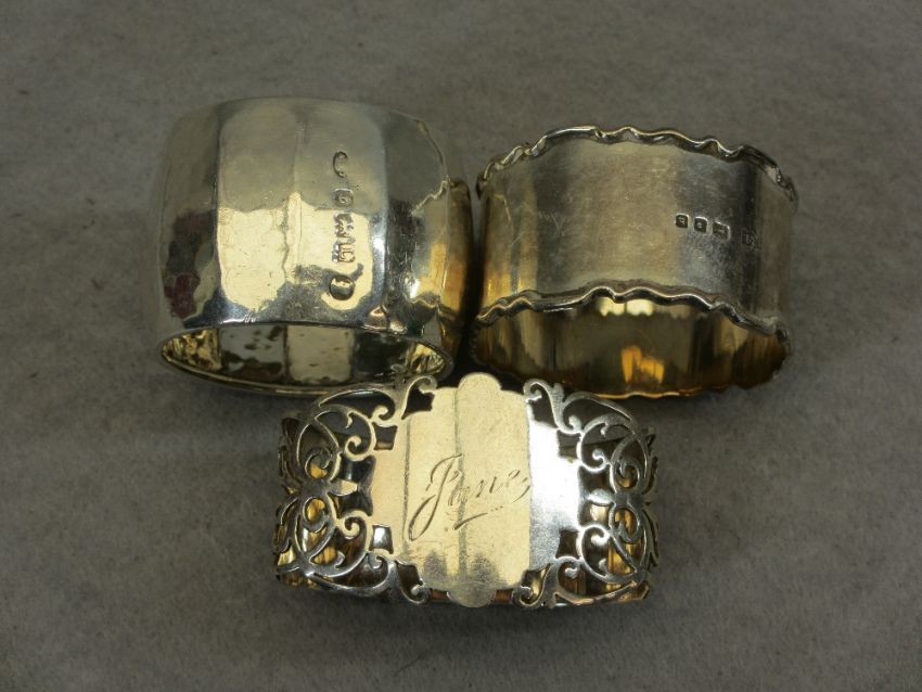 SMALL SILVER, 10 HALLMARKED ITEMS - a tea strainer, pair of salad servers, two napkin rings, one engraved 'Jane' and a small, loaded base trumpet vase, Birmingham hallmarks, various dates and makers along with a rat tail spoon, napkin ring and a damaged trumpet vase, London hallmarks, various dates and makers and a single teaspoon Sheffield hallmark, 9.3 ozt weighable