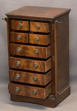 REPRODUCTION MAHOGANY WELLINGTON CHEST - four short over four long drawers with ring pull handles and twin half reeded column locking closers with keys on a plinth base, 82cms H, 46cms W, 38cms D