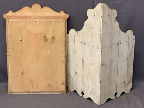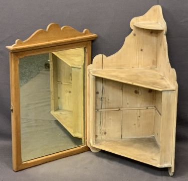 VINTAGE STRIPPED PINE CORNER WALL SHELF and a pine framed dressing mirror, 82cms H, 56cms W and 74cms H x 51.5cms W, measurements respectively