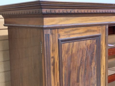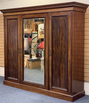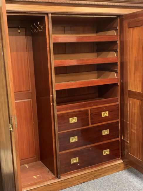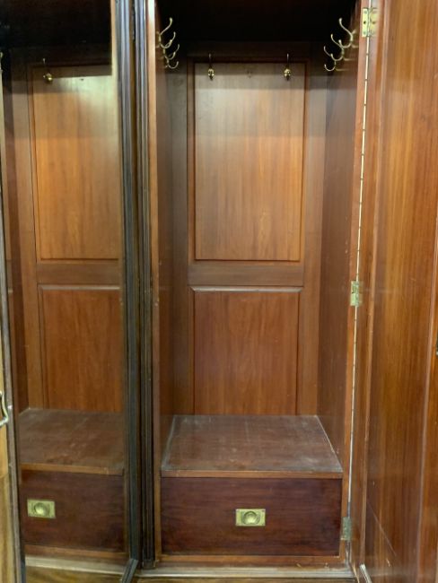 CIRCA 1900 MAHOGANY TRIPLE WARDROBE with dentil carved cornice and large central mirrored door opening to reveal three interior slides and a lower bank of two short over two long drawers with inset brass Campaign style handles, the mirror flanked by two single full length panel doors and interior brass hanging hooks, on a plinth base, oval metal label verso for Robert Weston, Liverpool, 214cms overall H, 246cms max W, 67cms max D