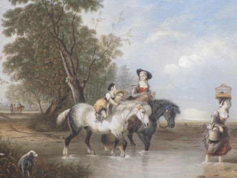 WILLIAM WARD mezzotint - shooting interest, Stephen Hemsted Esquire of Ilsley, Berks, 1814, Ryman & Co Fine Art Dealers, Oxford label verso, 66.5 x 47cms and after AUGUSTUS WALL CALLCOTT antique print - titled 'Returning Home from Market, Crossing the Stream', 40 x 50cms