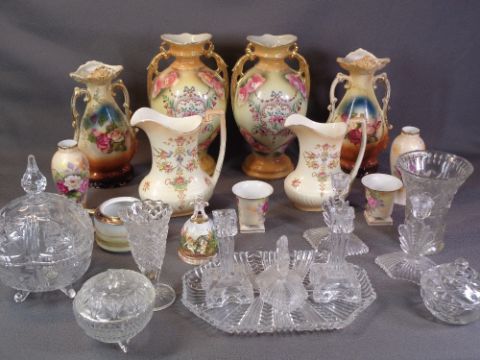 STAFFORDSHIRE VASES - two pairs, Crown Devon jugs and similar items, also slag and cut glassware, an assortment