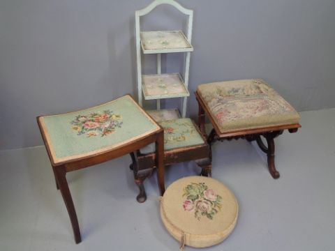 TAPESTRY TOPPED FOOTSTOOL - 19th Century 'X' frame, 48cms H, 44cms W, 44cms D, three other tapestry topped stools and a decorative plate stand