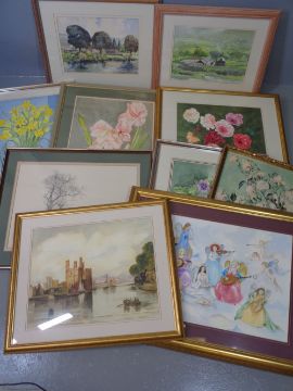 MAURICE A GREENWOOD watercolours, two - farmstead, titled 'Above Llanfairfechan', signed and dated 1992, 28.5 x 38cms AND farmstead, titled 'Conwy River', signed, 28.5 x 39cms AND a very large parcel of paintings and prints including SIR WILLIAM RUSSELL FLINT, J E HEWITT ETC