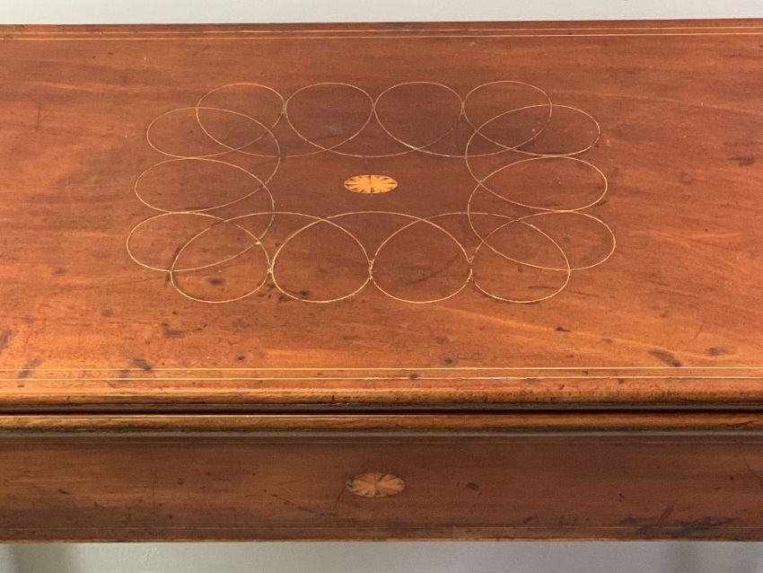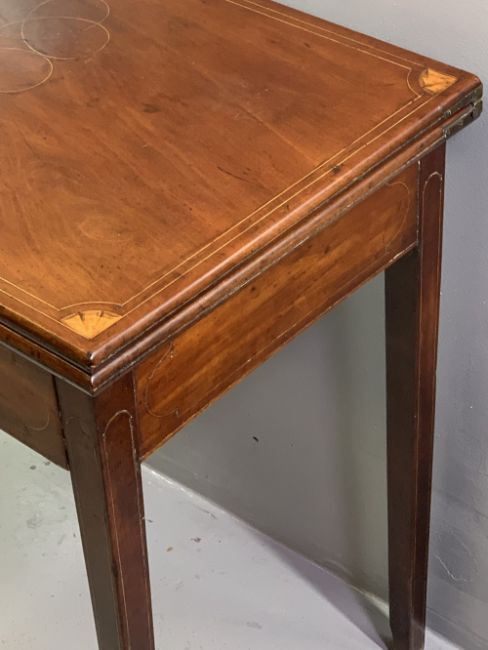 FOLDOVER CARD TABLE - circa 1830, mahogany with Sheraton style fan inlays and boxwood stringing, 71cms H, 91cms W, 90cms D (open)