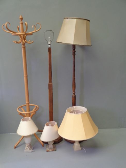 BENTWOOD HAT & COAT STAND in light wood, Art Deco style standard lamp, another standard lamp and an assortment of table lamps including mineral based