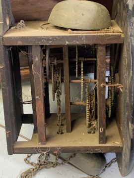 VINTAGE WALL CLOCK with pendulum and weights, single glazed door shelved cupboard, hinged front coalbox and a longcase clock hood (parcel of four)
