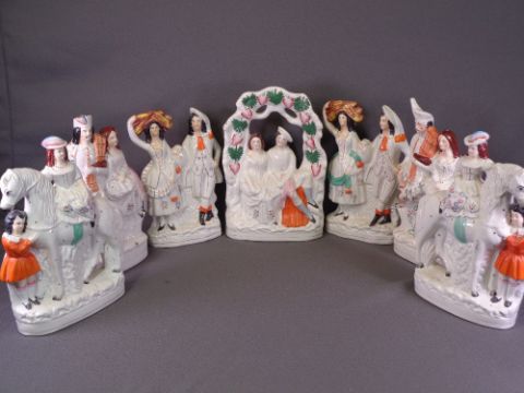 STAFFORDSHIRE FLATBACKS, three pairs and one other, 36cms H the tallest