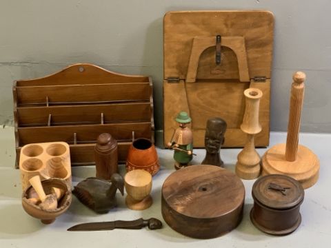 TREEN - good vintage letter rack, carved busts and a large assortment of other treen items