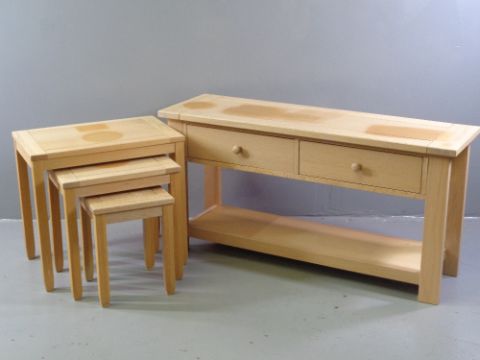 MODERN LIGHT WOOD TABLES - set of three and a similar short console table with two drawers and lower shelf, 58cms H, 114cms W, 35cms D