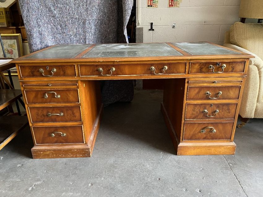 LARGE TWIN PEDESTAL DESK - reproduction yew effect with tooled leather effect top, multi-drawers and sliders, 78cms H, 159cms W, 87cms D