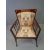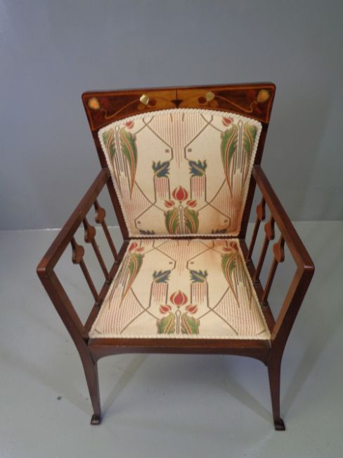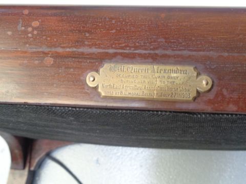 ARTS & CRAFTS MAHOGANY ELBOW CHAIR, mother of pearl inlaid uprights with Mackintosh style upholstery, bears a contemporaneous metal plate on the rear set edge declaring 'Queen Alexandra Occupied This Chair Only On Her Visit To The North East Agricultural Associations Horse Show, Held at Balmoral, Belfast, July 27th 1903'