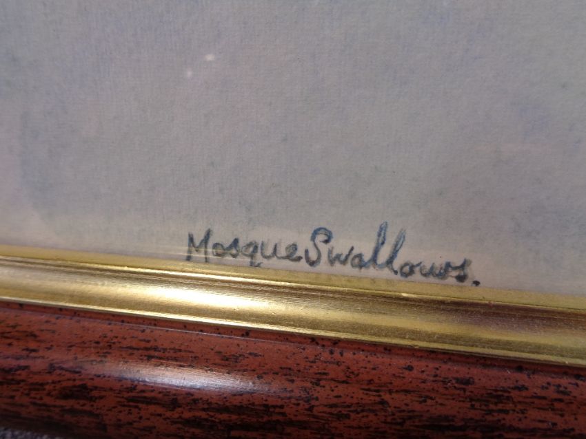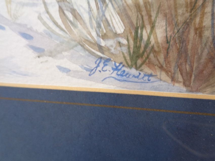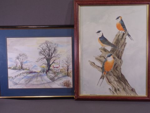 J E HEWITT watercolours, two - figure and dog on a snowy lane, signed right hand side, 35 x 44cms, the other entitled 'Mosque Swallows', three birds perched on a tree, signed, 60 x 44.5cms AND four other paintings/prints