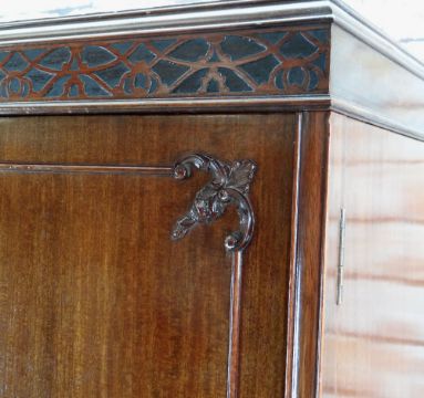 Condition Report: one lock missing, other lock lacks key, plinth base scraped edge, corner feet chipped and scuffed, interior hanging depth 19 inches.