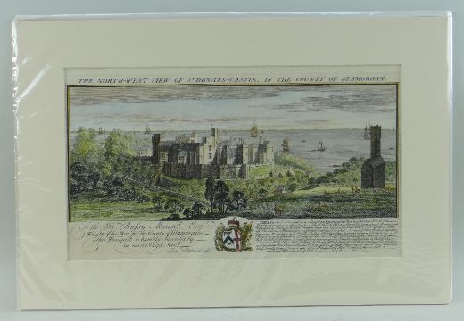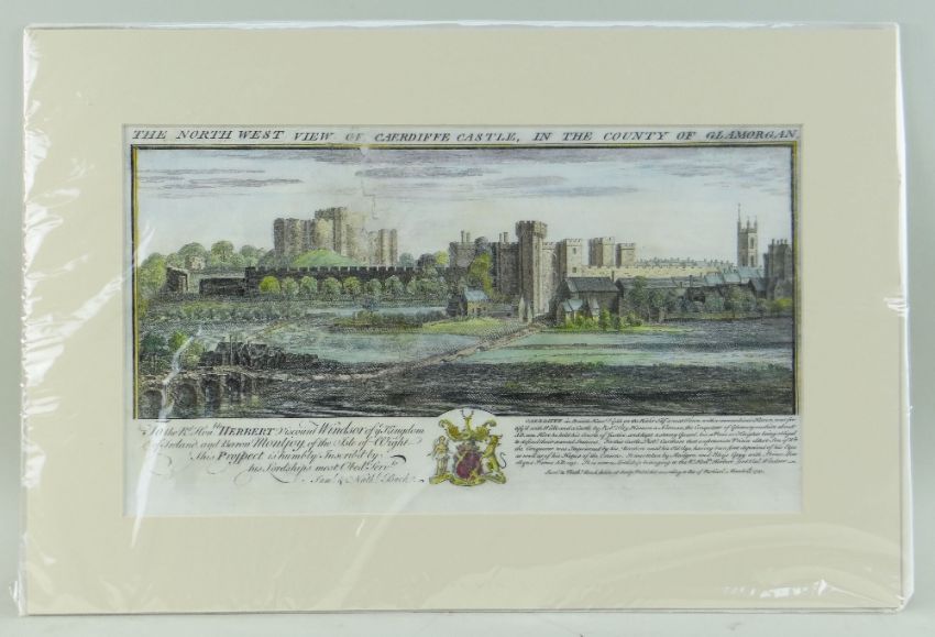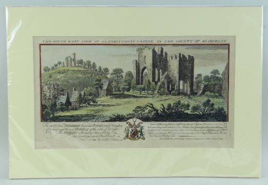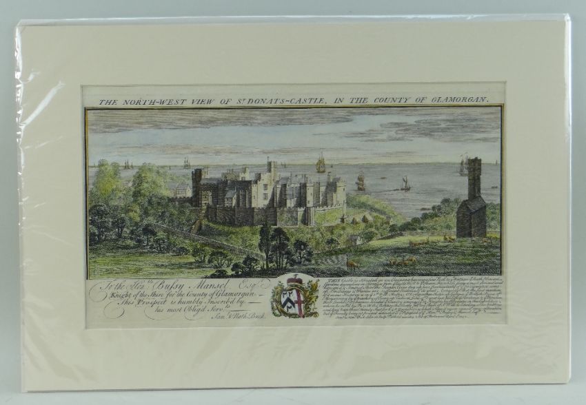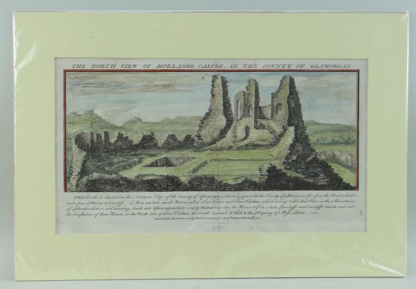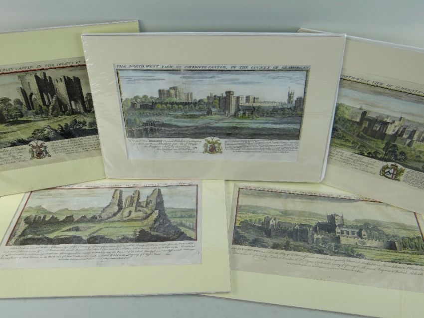 SAMUEL & NATHANIEL BUCK set of five coloured engavings -comprising (1)' ... Morlashe Castle', (2) ' ... Caerdiffe Castle', (3) ' ... Llanblythian Castle', (4) ' ... St Donats-Castle', and (5) ' ... Ewenny Priory', 21 x 37cms, mounted