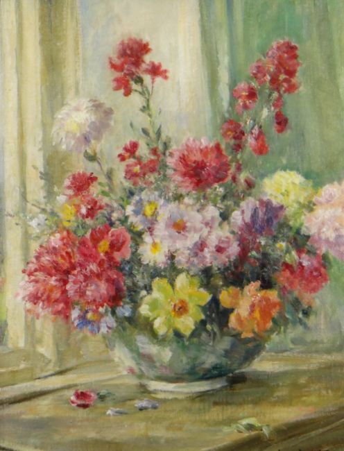 OWEN BOWEN (1873-1967) oil on canvas laid to board - still-life, entitled verso 'Spring Flowers', signed, 47 x 46.5cms