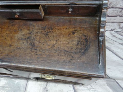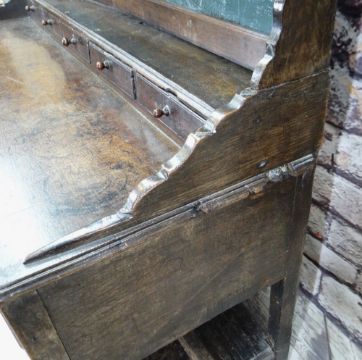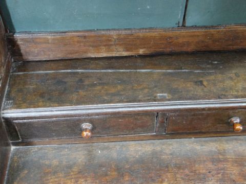 18TH CENTURY JOINED OAK WELSH DRESSER, probably Carmarthenshire, later painted boarded rack with cornice and shaped sides, above base fitted with row of spice and three frieze drawers above three arches and potboard, turned uprights, 155 x 50 x 274cm