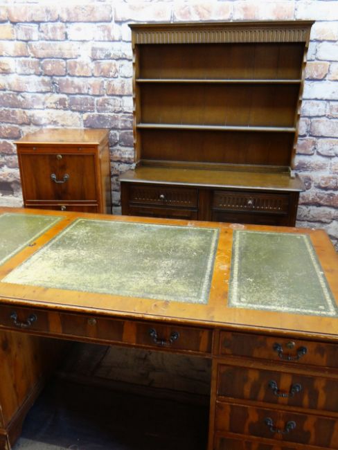 Condition: desk with damaged feet corners, leather worn, dresser scuffed.