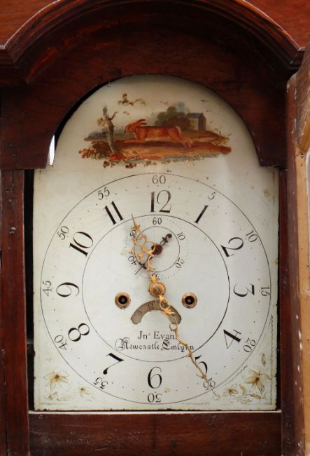 19TH CENTURY WELSH 8-DAY OAK LONGCASE CLOCK, Jno Evans, Newcastle Emlynn (sic), signed, painted 11 1/2in. dial with subsid. seconds dial and calendar aperture, swan neck pediment, and fluted columns to the break arch hood, shaped door and fluted canted angles, square base, 224cm high