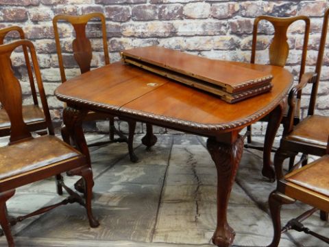 Condition Report: table top with burn mark, chairs with scratches and some with torn seats.