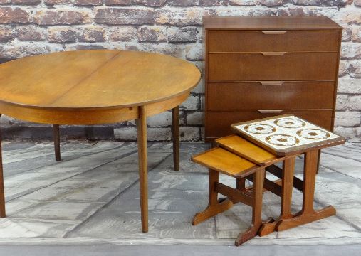 GROUP OF MID-CENTURY TEAK FURNITURE including Austin Suite four-drawer chest, 80cms high, G-Plan extending dining table, 168cms (extended) and nest of three G-Plan tiled occasional tables (3)