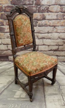 ANTIQUE CARVED OAK SIDE CHAIR, later floral upholstery