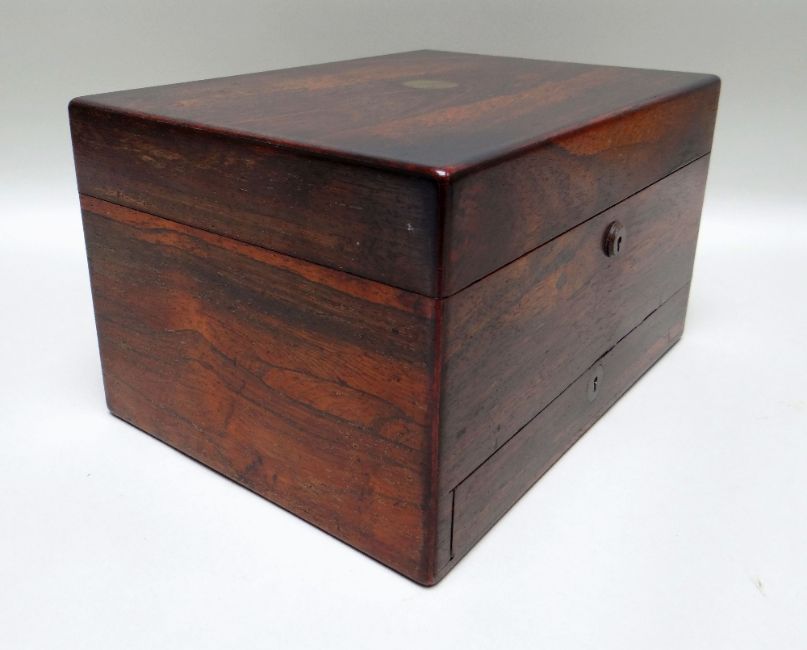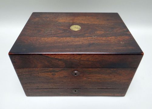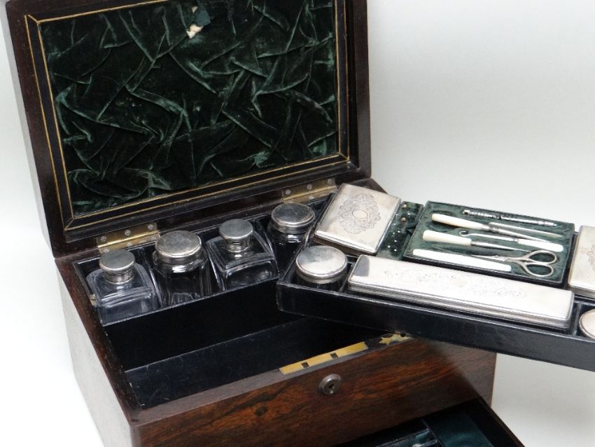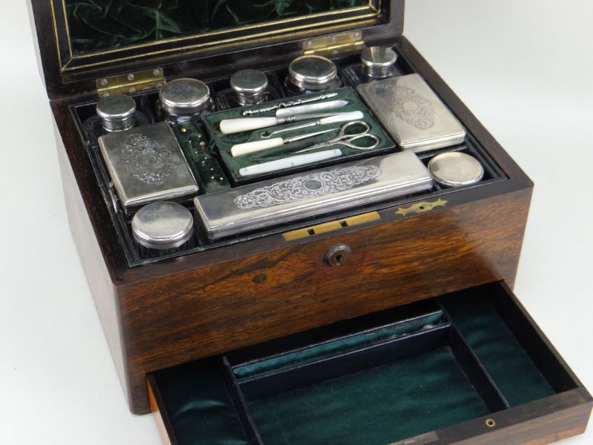19TH CENTURY ROSEWOOD GENTLEMAN'S VANITY CASE, fitted interior containing electroplate mounted glass bottles, manicure accessories, leather and velvet lining, 32.5 x 24 x 18.5cms