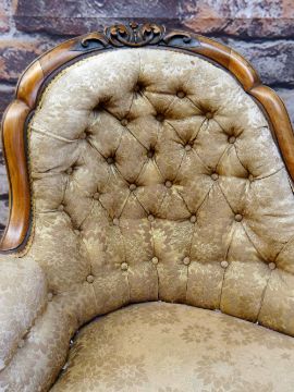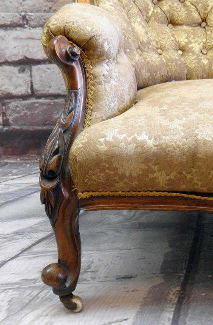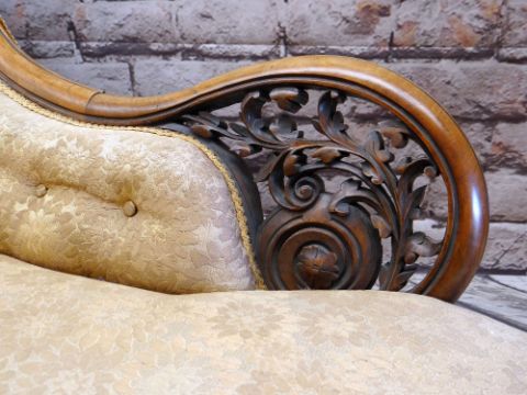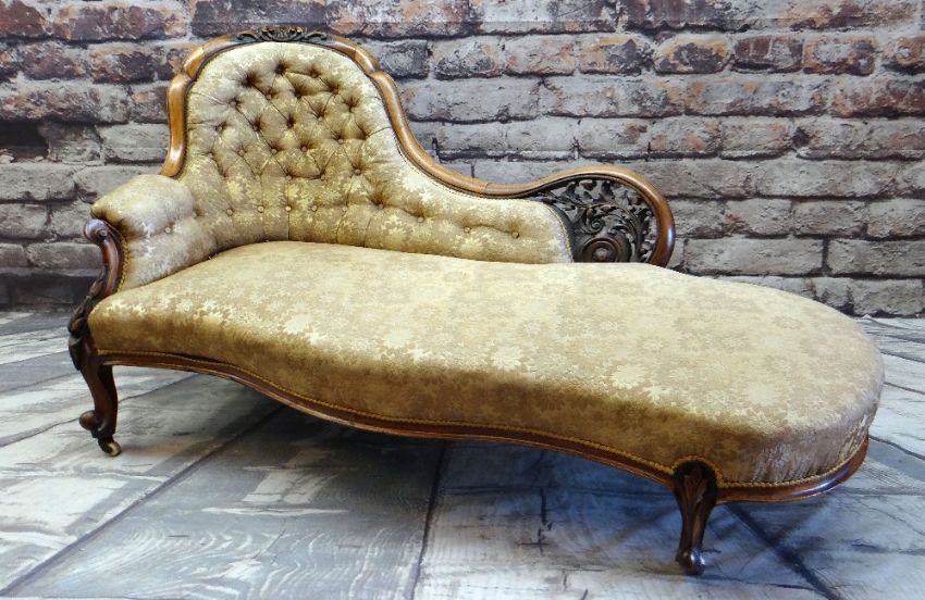 GOOD MID-VICTORIAN WALNUT SERPENTINE CHAISE LONGUE, carved and pierced back with button upholstery, deeply carved foliate scrolled arms and legs, ceramic castors, 174cms long