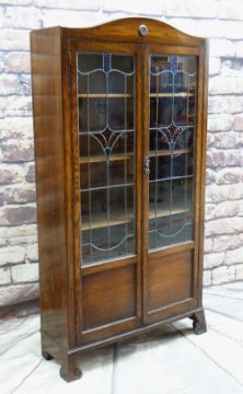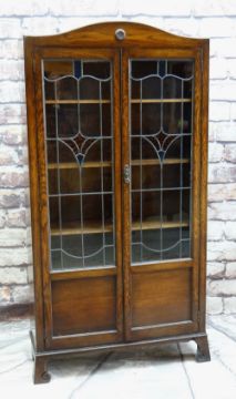 EARLY 20TH CENTURY STAINED OAK & LEADED GLASS BOOKCASE, arched top and scrolled bracket feet, 183cms high