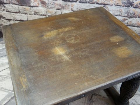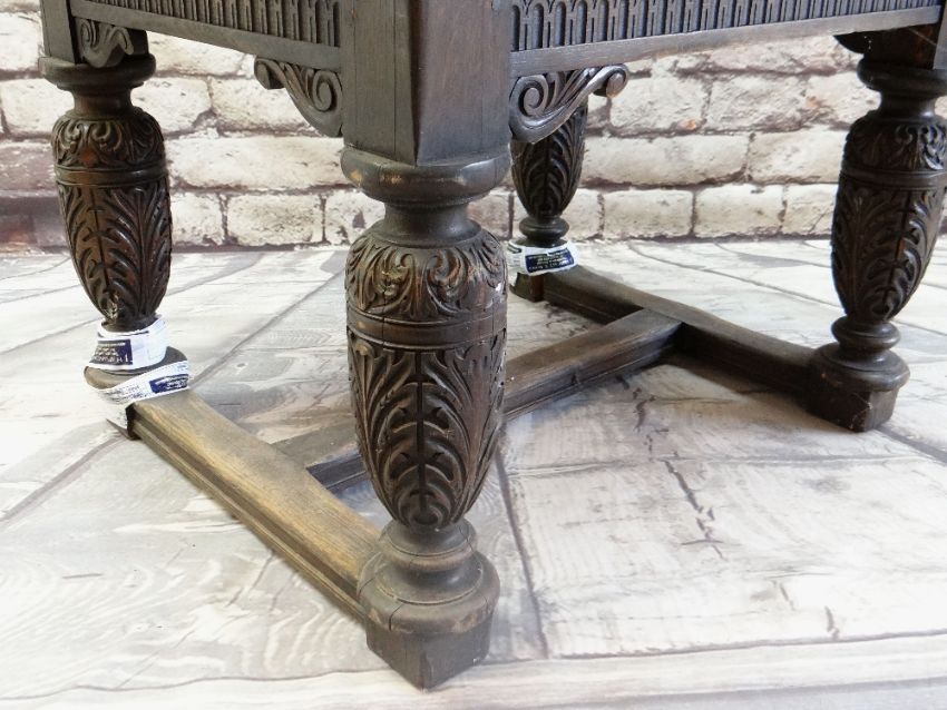 ELIZABETHAN-STYLE STAINED OAK DRAW LEAF DINING TABLE, 283cms long (extended))