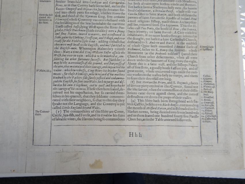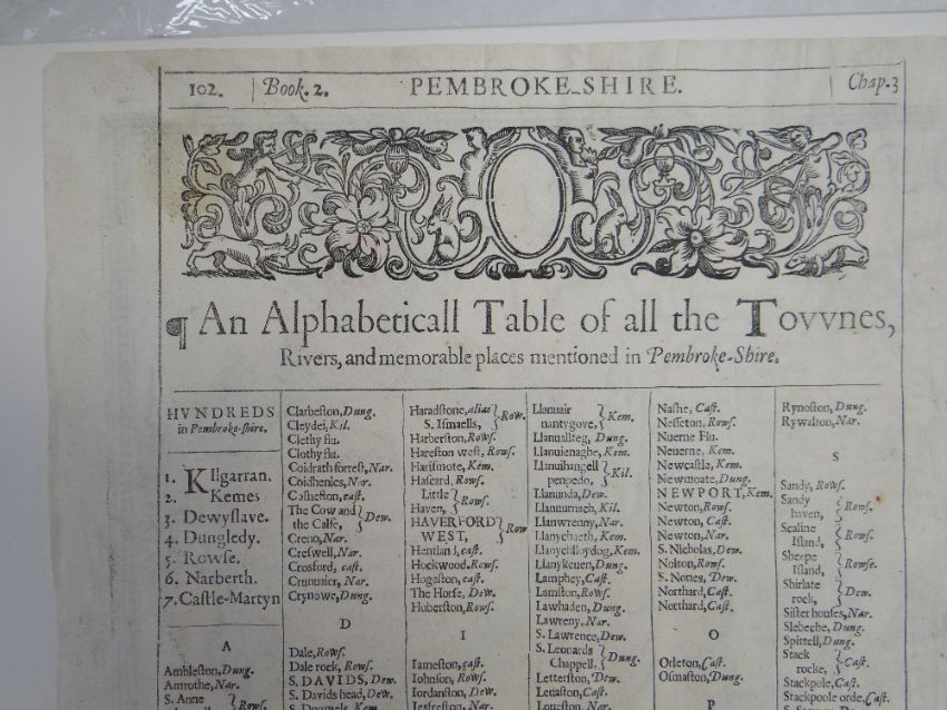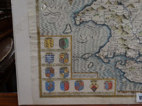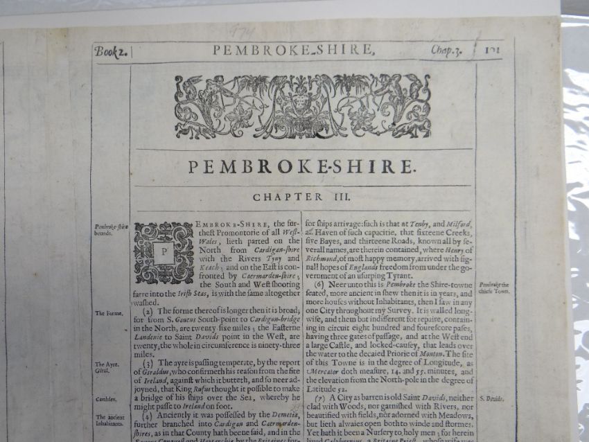 JOHN SPEED antique map of Penbrokeshyre (Sudbury & Humble) 1627, later coloured 42 x 54cms, unframedThere is some light staining and a few corner folds.There are no rips or tears.