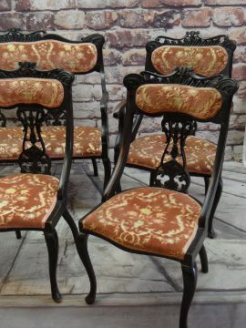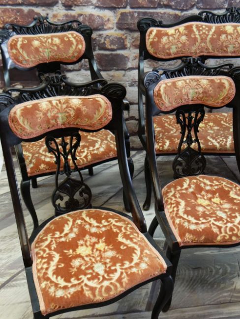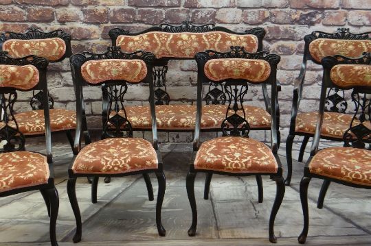 EARLY 20TH CENTURY EBONISED SALON SUITE, carved cresting rails and splats, comprising settee, two armchairs and four side chairs (7)