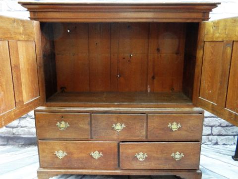 19TH CENTURY WELSH OAK PRESS CUPBOARD, shaped cornice above pointed arch panelled doors, on a chest base fitted with five drawers, bracket feet, 142.5 x 53 x 154cms