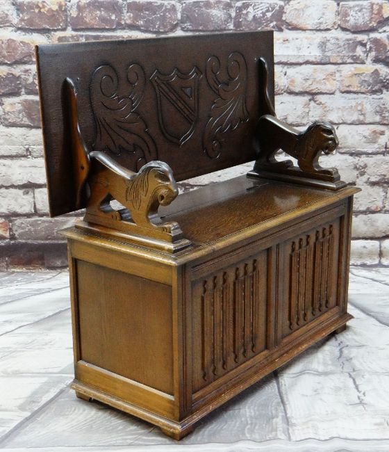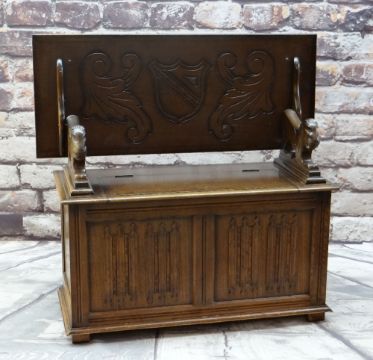 REPRODUCTION OAK MONK'S BENCH with lion arm supports, shield carved top and linen fold front, 106cms wide
