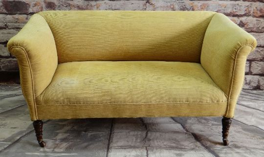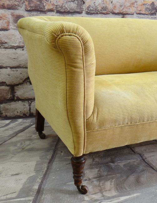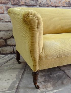 VICTORIAN WALNUT TWO-SEATER SOFA, later yellow ribbed upholstery, turned legs, castors 142 x 70cms