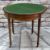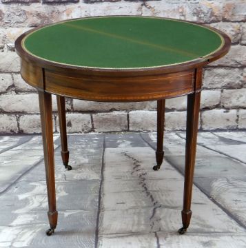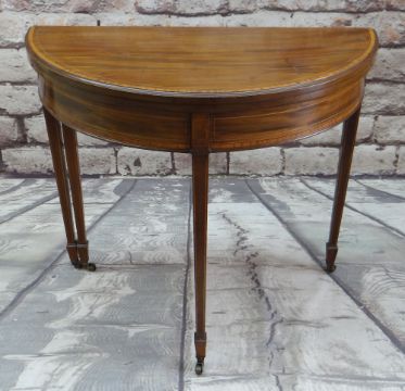 GEORGE III-STYLE MAHOGANY, SATINWOOD CROSSBANDED & BOXWOOD STRUNG CARD TABLE, of demi lune form, with green baize and tooled leather edged inset playing surface, tapering square legs, castors, 84cm diam.