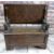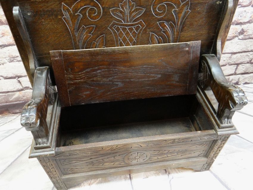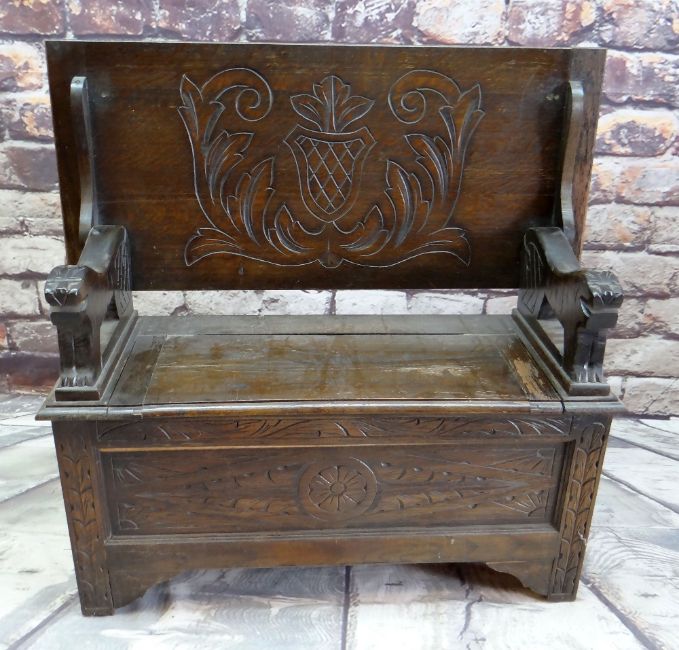 REPRODUCTION OAK MONK'S BENCH, lion carved arms and engraved shield top, 107cms wide