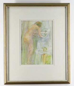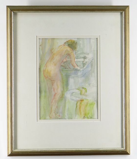 ANDRE BICAT (1909-1996) two watercolours - (1) titled on Attic Gallery Swansea label 'Morning Toilet', signed, 23 x 17cms and (2) titled on Attic Gallery Swansea label 'S Giorgio from Riva Jesu Schiavoni' (Venice), signed, 27 x 37cms, framed and glazed