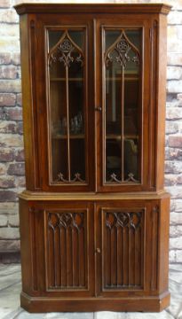 REPRODUCTION GOTHIC-STYLE STAINED OAK STANDING CORNER CABINET, with tracery doors, and carved cupboard door, 215cm high